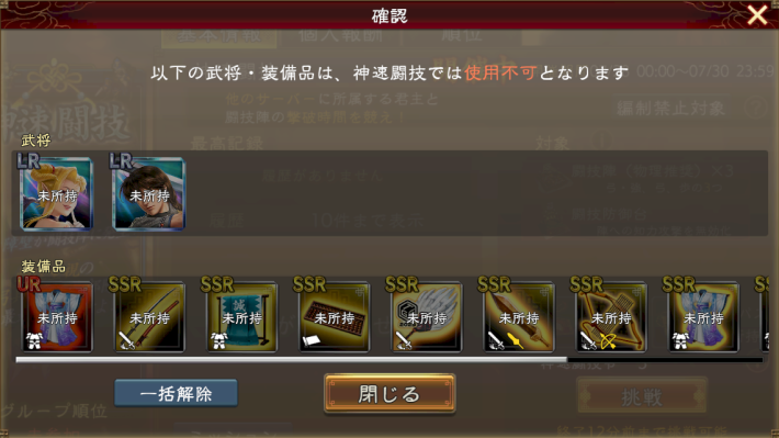 神速闘技や君主戦など一部のイベントでは、使用できる武将や装備品に制限がかかる。繁体字版ユーザーとは同じ条件でイベントPtやランキングを競うので、日本語版のユーザーが不利になることはない。