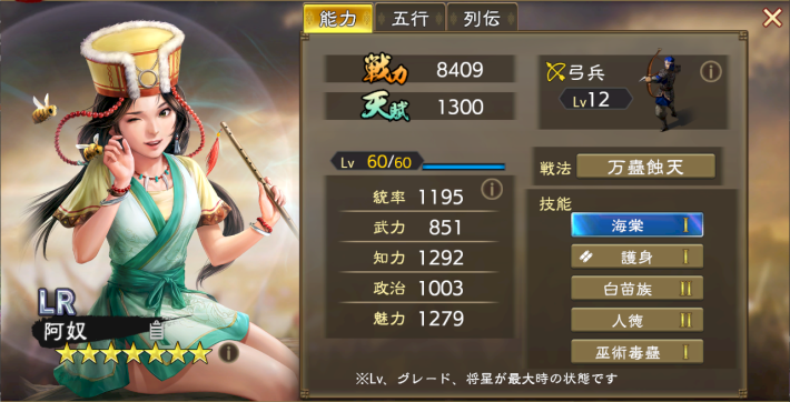 LR阿奴は敵部隊の妨害に特化した知力弓兵武将。技能「巫術毒蠱」がLv2の場合、無条件で交戦開始時から敵4部隊に