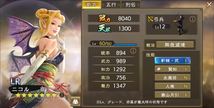 ![]() | 兵科:![]() ![]() ・会心攻撃が得意な物理騎兵武将 ・主将適性が非常に高い ・将星★7 + 専用名宝★7の性能が強力 |