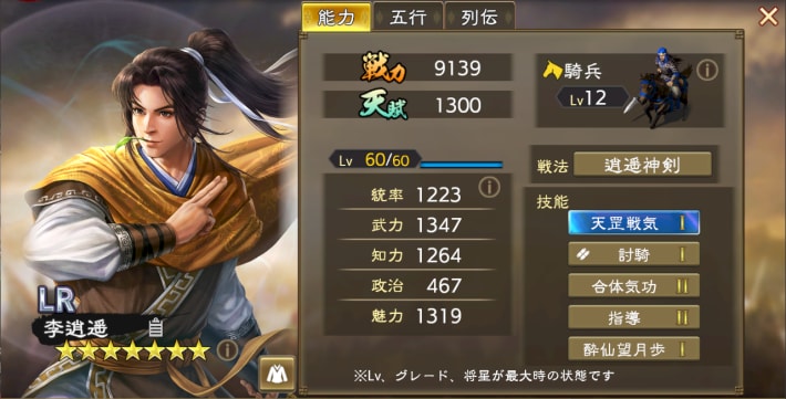 LR李逍遥は会心攻撃が得意な物理騎兵武将。戦法や技能で自部隊の機動を上昇させるので、将星★7であれば付近の賊を相手に戦法を発動してから、敵プレイヤーの都市や拠点にターゲットを変更する使い方が強力。