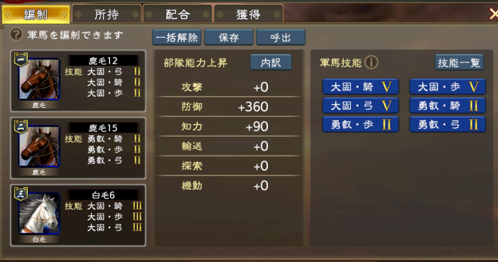 ![]() | 各兵科の『大固・〇』と『勇叡・〇』を優先して集めています。以下、自分が使っている軍馬編制になります。 |