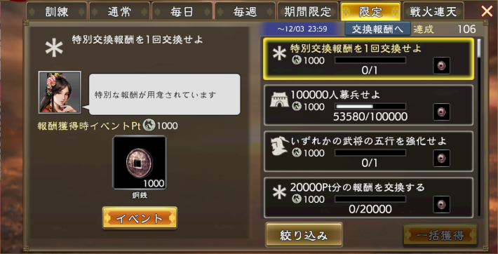 ミッションを達成してイベントPtを集めた後は、イベント画面から欲しい報酬と交換しよう。報酬は「交換報酬」と「特別交換」があり、特別交換は「佩玉手形」の数に応じて交換可能な報酬が増える。