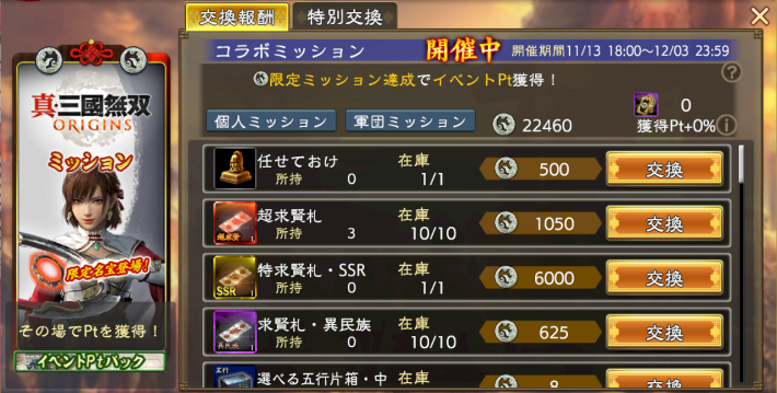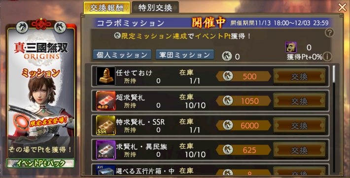 真・三國無双 ORIGINSミッションは、限定ミッション達成で獲得できるPtとアイテムを交換するイベント。同時販売の「佩玉手形」の所持数に応じて特別交換報酬やミッションが追加される。