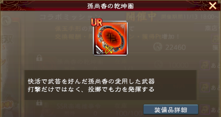 特別交換報酬にはコラボ限定名宝「孫尚香の乾坤圏」が用意されている。孫尚香の乾坤圏はコラボLR孫尚香の技能「旋空発破」と「明月陣」を強化するので、将星★7のLR孫尚香を主将で使うなら回収しておこう。