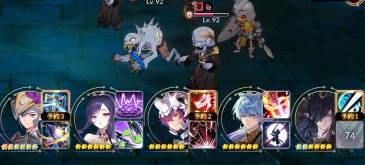 パーティ編成画面右上のアイコンから、アタッカーの広範囲技を中心にスキル予約をしておきましょう。また、戦闘画面で自動スキル設定をONにしておくと、予約スキル使用後も自動で戦闘が進むのでおすすめです。