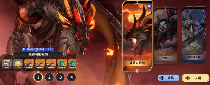 破壊の眼光レイドでは難易度3から星5、難易度7から星6装備を獲得できます。上位の難易度ほど高ランクの装備を獲得しやすく、10以上では星6確定です。なお、各難易度の初回クリア時は100ルビーを入手可能です。