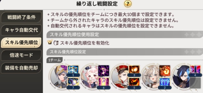 上記は優先順位1~3でバフ/デバフを、優先順位4でメインアタッカーの攻撃を、優先順位5~6でデバフやパーティを立て直す流れを繰り返す設定です。7は使いませんが、キャラが倒された場合に備えて設定しています。