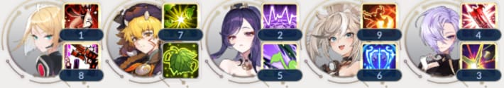 ![]() | あくまでこちらは一例です。育成状況によっては別の順番の方が安定する場合もあります。なお、8と9は基本発動しませんが、エスパーダで削り切れなかった場合に備えて設定しています。 |
