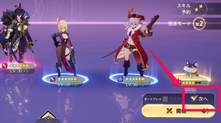 パーティ編成画面右下の「次へ」のチェックボックスにチェックを入れ、オートプレイをONにしましょう。自動で次の戦闘が始まるようになります。