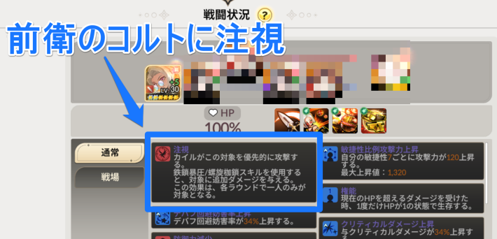 カイルは攻撃力が最も高い敵を優先的に攻撃する「注視」を所持しています。カイルの注視を後衛のメインアタッカーとは別のキャラに引き付けたいときにも、一番槍の装備セットは役立ちます。