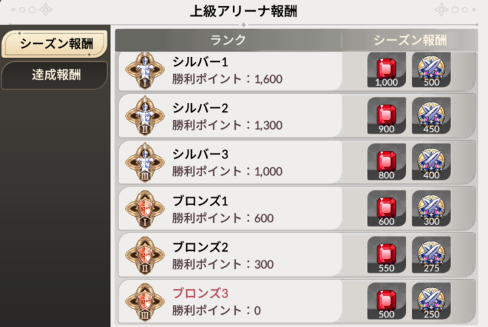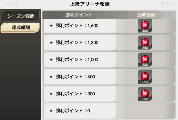 上級アリーナのバトルに勝利すると勝利ポイントを獲得できます。そのポイント数が一定以上になると、達成報酬としてルビーを獲得できます。