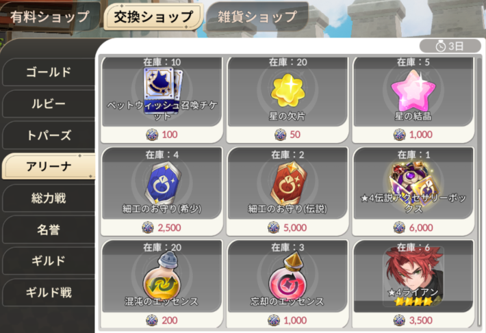 上級アリーナの交換ショップでは星4ライアンの交換が最もおすすめです。混沌/忘却のエッセンスは難易度11以上の各種レイドでも入手できるため、交換優先度は下がります。