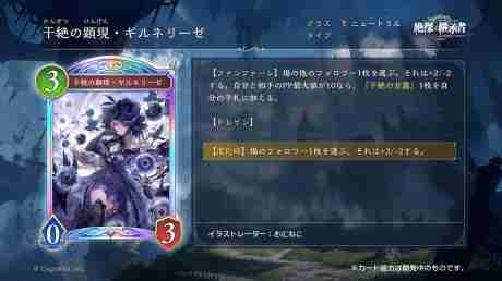旧シャドバではファンファーレがない代わりに2/2/2(進化すればなんとリーダーを6回復できる)で、PPが10になると勝手にデッキから出てきて干絶の甘露をサーチし、干絶の甘露は0コスで「アルティメットバハムートを出されていなければ勝利する」と書かれていた。