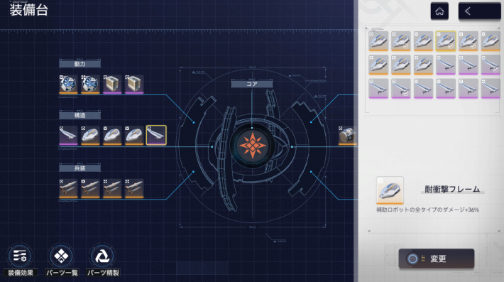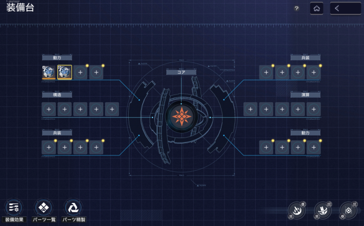 補助ロボットは動力・構造・兵装・演算の4部位に、最大6~8つのパーツを装備して、性能を強化する事ができます。装備画面には、補助ロボット画面左下の装備台アイコンをタップする事で移動する事が可能です。