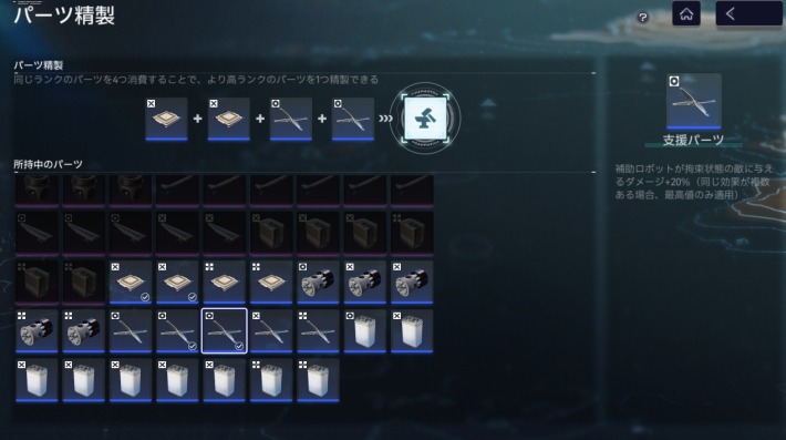低レアのパーツはパーツ精製機能で合成すると、上位レアのパーツに変換していく事が可能です。バフ試練で手に入れた使わないパーツは、高ランクパーツの入手に活用しましょう。