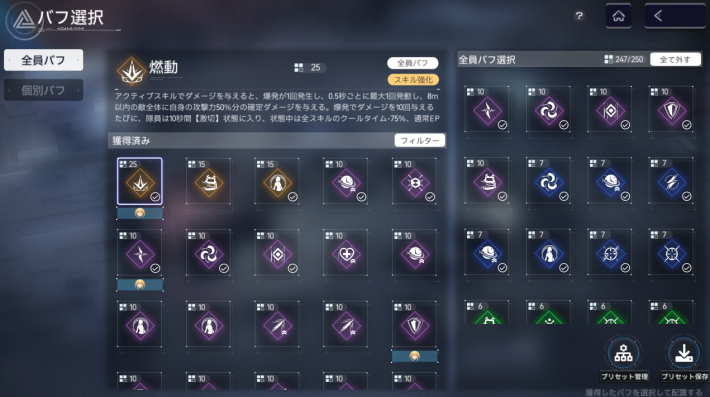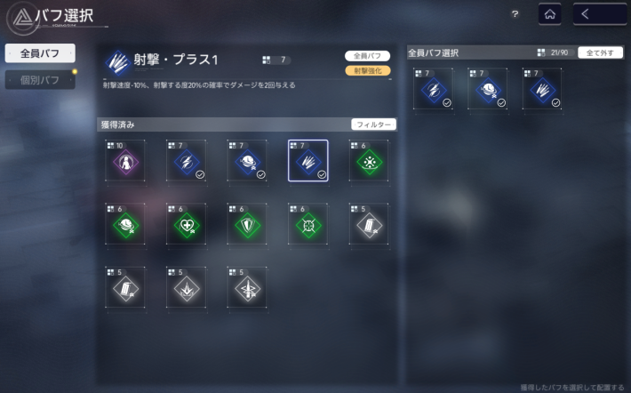 バフ毎に必要ポイントが割り振られており、ポイント上限まで自由に組み合わせる事ができます。おすすめバフを選択した後は、時間内になるべく撃破するため、アタッカーに合うスキルか射撃系の火力バフがおすすめで、キャラ個別バフもアタッカーを優先しましょう。