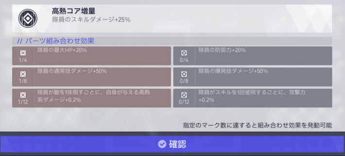 パーツにはそれぞれ異なる効果に加えて、3種類のマークが付いており、同じマークを最大12個組み合わせて追加効果を獲得できます。隊員強化パッシブの組み合わせ効果は腐りづらいので、最優先で発動を狙うと良いでしょう。