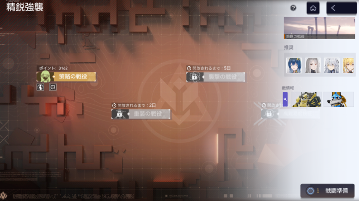作戦開始画面の左下からは、装備するバフを選択する事ができます。蟻穴の清掃や精鋭強襲では、編成しているキャラのおすすめを確認できるので、まずはおすすめを参考に配置していきましょう。