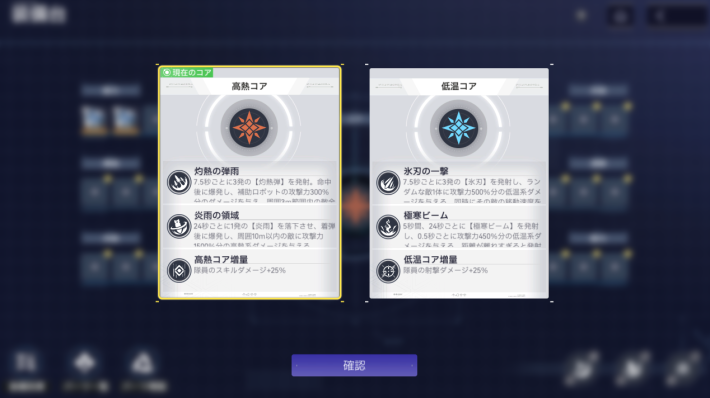 パーツの装備画面でコアをタップする事で、2つあるコアから1つ選択して変更する事ができます。それぞれスキルダメージと射撃ダメージの強化効果があるので、パーティのアタッカーに合わせてコアを選びましょう。