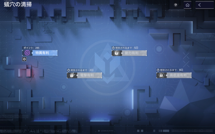 蟻穴の清掃は時間制限内に登場する敵を倒し続けてポイントを稼ぐモードです。ステージごとに有利なタイプがあるため、ステージに有利なアタッカーで挑むと良いです。