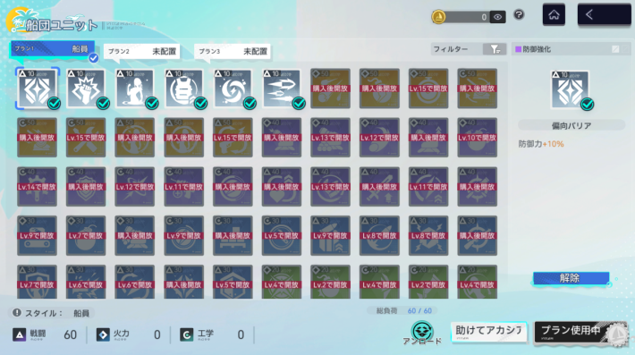 結束大船団では挑戦前に船団ユニットを配置しておく事で、自身のステータス強化や追加効果の恩恵を受ける事ができます。配置できるユニットの数や種類は、ステージクリアやレベルを上げる毎に増えていくので、最初はステージクリアを優先しましょう。