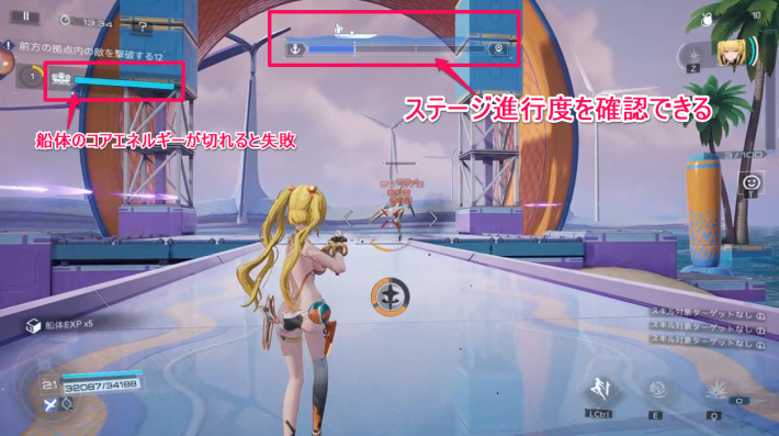 戦艦に乗り込んだ後は、敵の襲撃から船体を防衛してエネルギーを守りつつ、最終的にボスを撃破する事でクリアとなります。画面中央上部のゲージが進行度の目安になるので、チェックしつつ進めていきましょう。