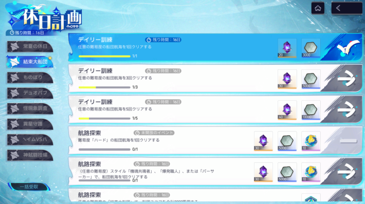 | Point! | ウィークリーミッションも結束大船団のクリアで達成可能です。 |