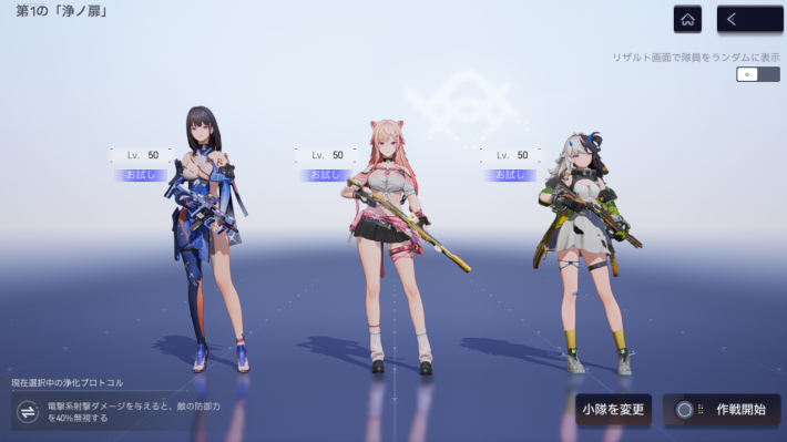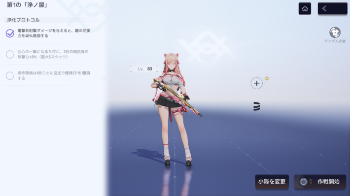 戦闘準備画面では、戦闘を有利にする3つの浄化プロトコル(バフ効果)から1つを選択して装着できます。戦闘をスムーズに進めやすくなるため、編成キャラに合わせて相性の良い効果を選びましょう。