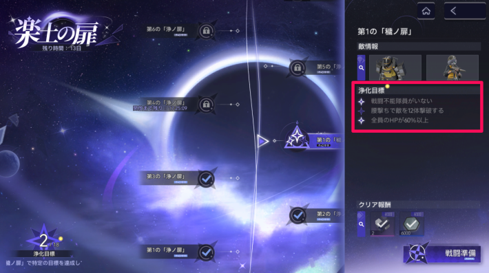 穢ノ扉ステージにはクリア目標があり、達成することでクリア報酬や浄化報酬を獲得できます。意識せずにクリアすると目標達成を逃す場合があるため、事前にミッションを確認してから挑戦しましょう。