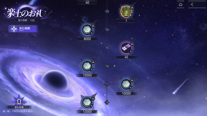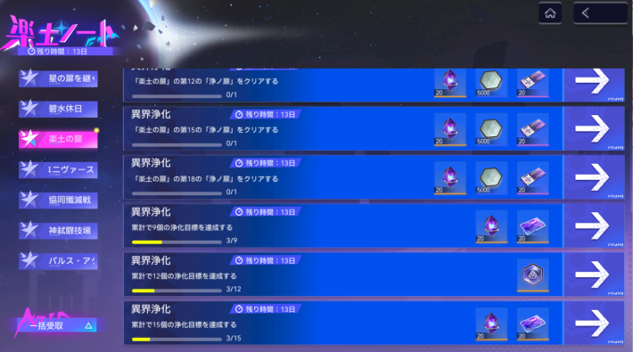 穢ノ扉ステージで目標を達成した状態でクリアすると、浄化目標報酬を獲得できます。ショップの交換チケットや限定名刺が手に入るので、ステージ目標を意識してクリアするようにしましょう。