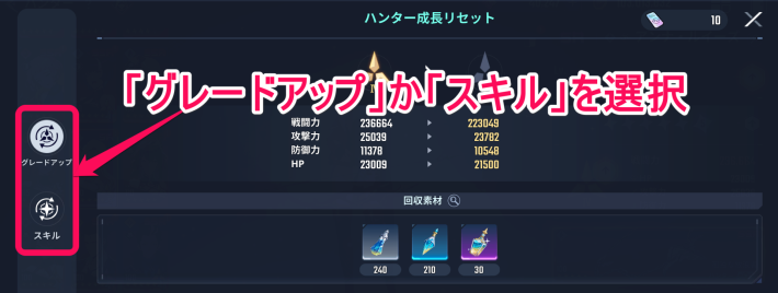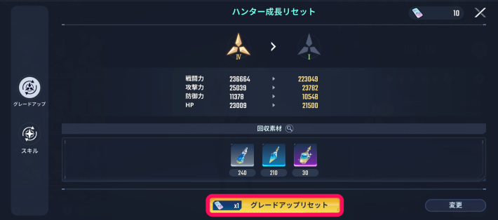 8/28(木)アプデ後に実装された成長リセット機能で、ハンターのグレードアップとスキルレベルのリセットが可能になった。リセットには「リセットチケット」を使用する。