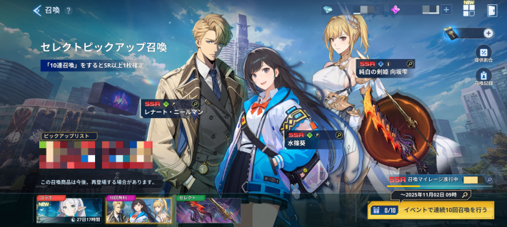 召喚のマイレージで入手したSSRがセレクトリストの4種類以外の対象だった場合は、次のマイレージでリストの4種類の中から1つを確定入手することができる。