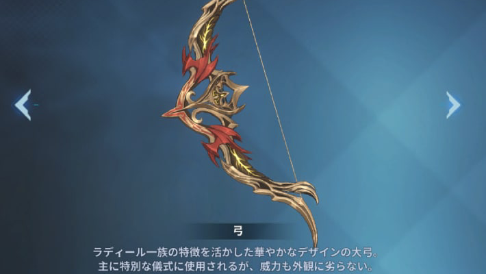 武器スキルの矢が敵を貫通する度にダメージが4%増加する効果を持つ。武器効果を活かすためにも、多段ヒットするような大きな敵(カサカ)や複数の敵との戦闘でこの武器を装備するのがおすすめ。
