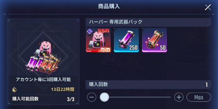パック購入で、ハーパーの専用武器「マリシャス」と武器強化ギアⅡ・Ⅲが貰える。製作やイベントでの入手に頼らずハーパーの専用武器がすぐに欲しい人におすすめ。