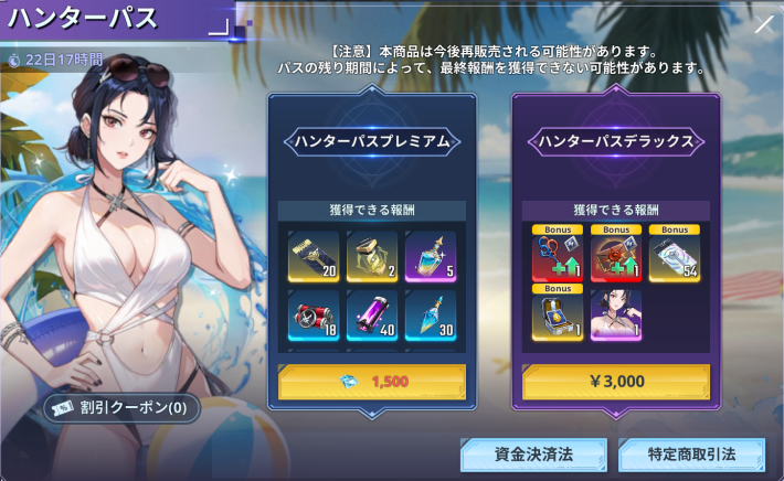 Tips | 「ハンター協会プレミアム定期購入チケット」を購入/継続したユーザーには、「ダイヤ割引クーポン」が支給される。 |