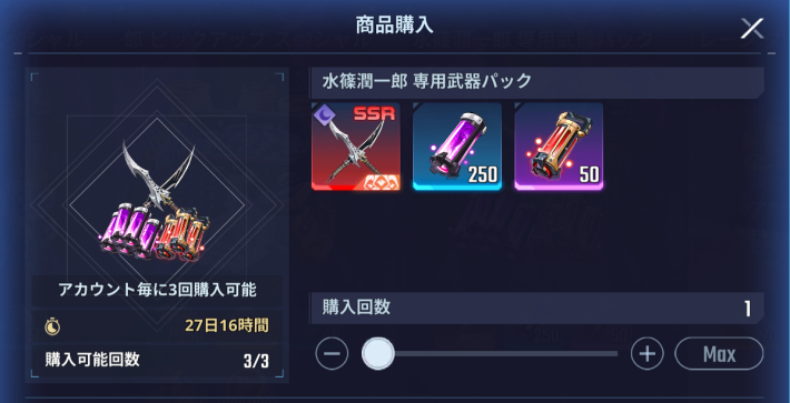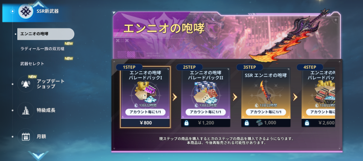前の段階を購入すると、次の段階が購入可能になるパック。水篠旬の新武器「ラディール一族の双刃槍」が最大2つ入手可能。