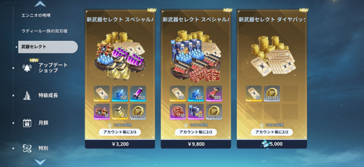 武器セレクトPU召喚チケットや武器育成素材などが貰えるパックが購入可能。新武器が追加された武器セレクトPU召喚を引きたい人は、当ショップでパックを購入しておこう。