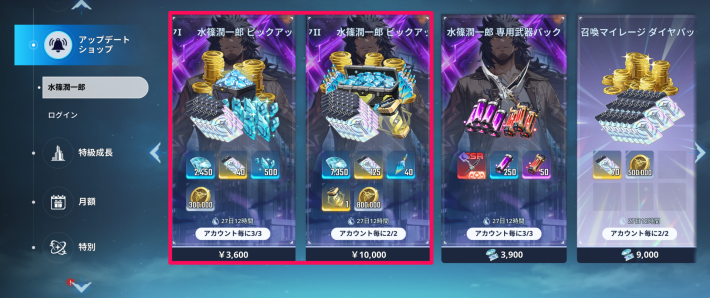 パック購入で有償ダイヤとPU召喚チケットなどが貰える。PU召喚チケットが欲しい人は購入を検討しておこう。