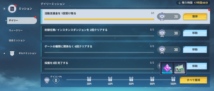デイリー/ウィークリーミッションをクリアすることで名声と魔法石がもらえる。また名声を上げることで魔法石がもらえたり、ピックアップ召喚チケットがもらえるので毎日プレイしていこう。