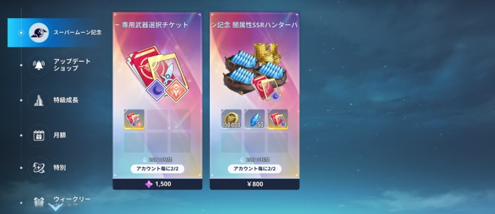 スーパームーン記念ショップでは、闇属性ハンター専用武器チケットや闇属性SSRハンターパックが購入できる。なお、専用武器チケットの方は魔法石1500個で購入可能なので、闇属性ハンターの専用武器が欲しい人は購入を検討しておこう。