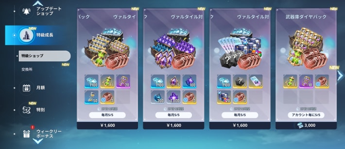 特別タブは、成長/入場チケット・通貨/スキン/ステップアップの4つのタブで構成されている。商品によって購入財貨が異なるので注意しておこう。