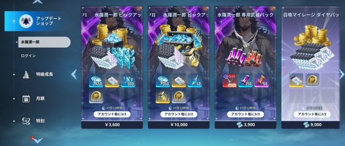 水篠潤一郎タブでは、お得な価格でPU召喚チケットが購入できるパックや、潤一郎スキンパックなどが販売されている。PU召喚チケットが欲しい人はこちらのタブを確認しておこう。