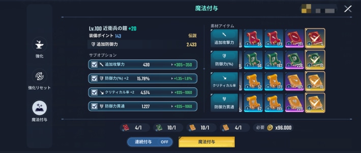 魔法付与を行うと、素材アイテムで指定した範囲内でランダムな数値がサプオプションに追加される。指定した素材アイテムの品質が高いほど数値が高くなるので、なるべく高品質の素材を選ぼう。