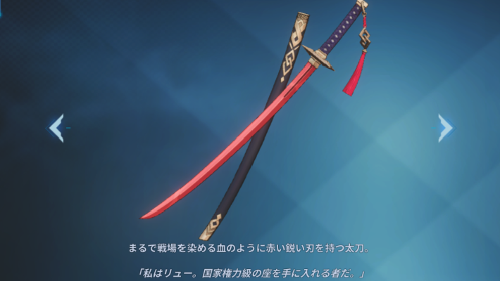 この武器を装備したリューが通常スキル2を使用すると15秒間クリティカルダメージが増加する。進化をすればクリダメ増加の倍率が増加するので、進化させて倍率を上げておきたい。