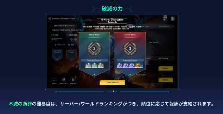 不滅の断罪で獲得したスコアに応じて、サーバー/ワールドランキングがつく。シーズン終了時に、ランキングに応じた報酬が貰える。