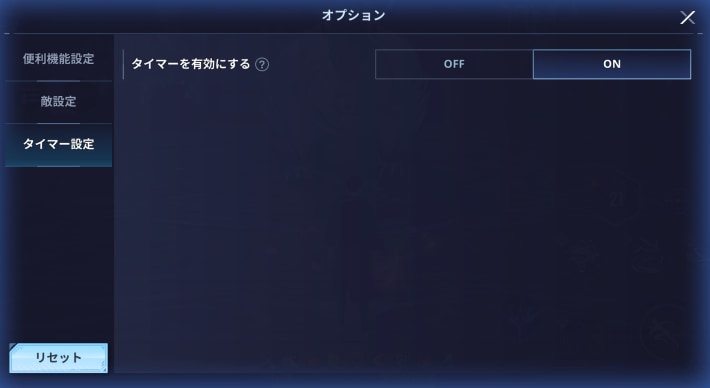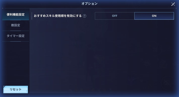 トレーニングルームの歯車のボタンを押すと、オプション画面が開く。オプションでは、便利機能・敵・タイマー設定の変更が可能。初期状態に戻したい場合、画面左下にある「リセット」をタップしよう。