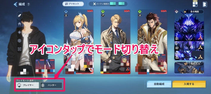 編成画面が開くので、画面左下にある「プレイヤー」「ハンター」のアイコンをタップしてプレイモードを選択しよう。