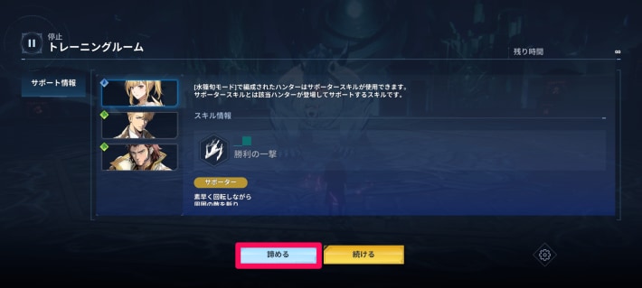 トレーニングルーム | ・プレイヤーモード/ハンターモードでプレイ可能 ・スキルの性能確認やコンボの練習ができる |