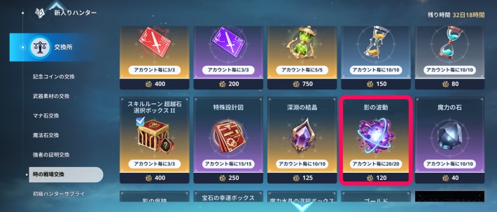 影の波動は、時の戦場交換で入手可能。交換所で使用する「時のメダル」は、時の戦場Seasonの各ステージで記録を残し、記録の集計終了後に貰える。