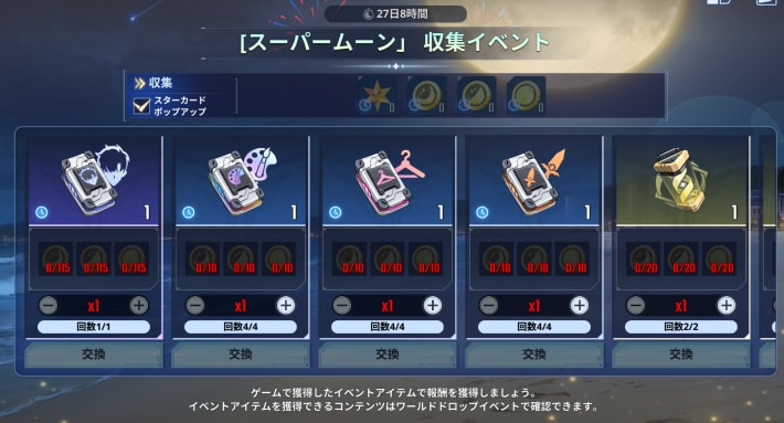 製作イベントで必要な素材「武器スキン設計図A~D」は、スーパームーン収集イベントで入手可能。交換に必要なスーパームーンコインは、ゲート/封鎖任務/インスタンスダンジョン/混沌の戦場をクリア時にドロップする。